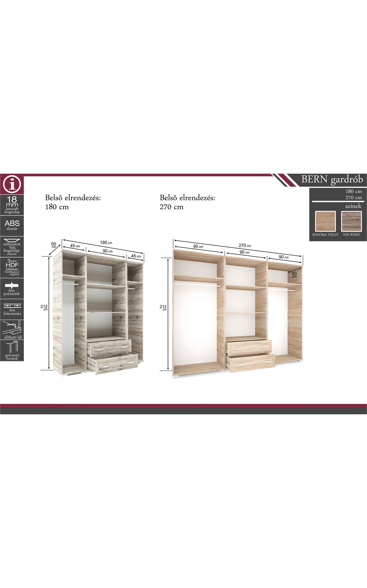 Klasszikus sílusú. Belső elrendezése igyekszik minden igénynek eleget tenni. A tükör növeli a teret és komfortosabbá teszi az öltözködést.