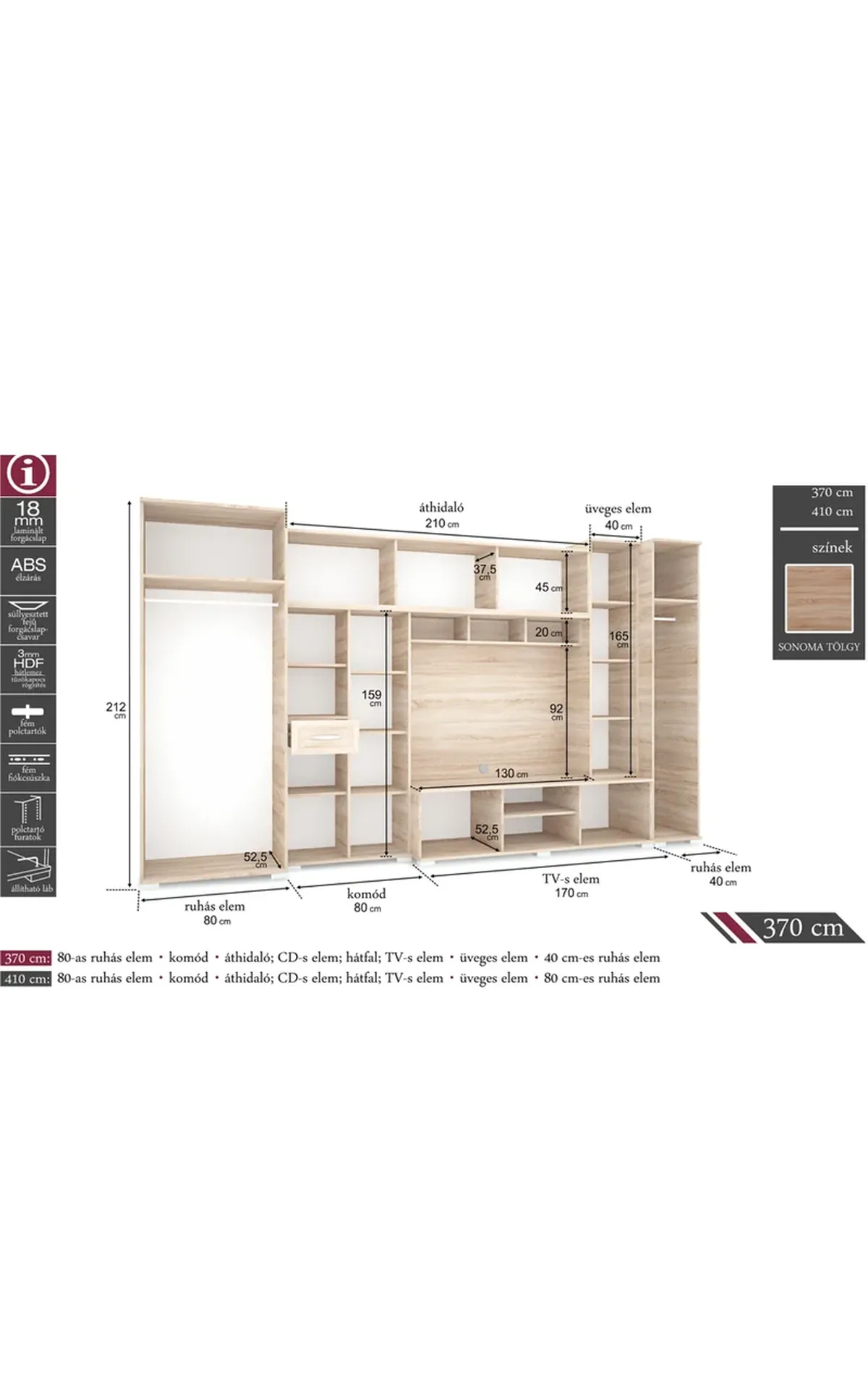 Klasszikus nappali szekrénysor. Sonoma színben érhető el amely a legtöbb otthonba könnyedén beilleszthető. Nappali szekrénysor szerepe mellett nem okoz gondot a ruhák tárolása sem.