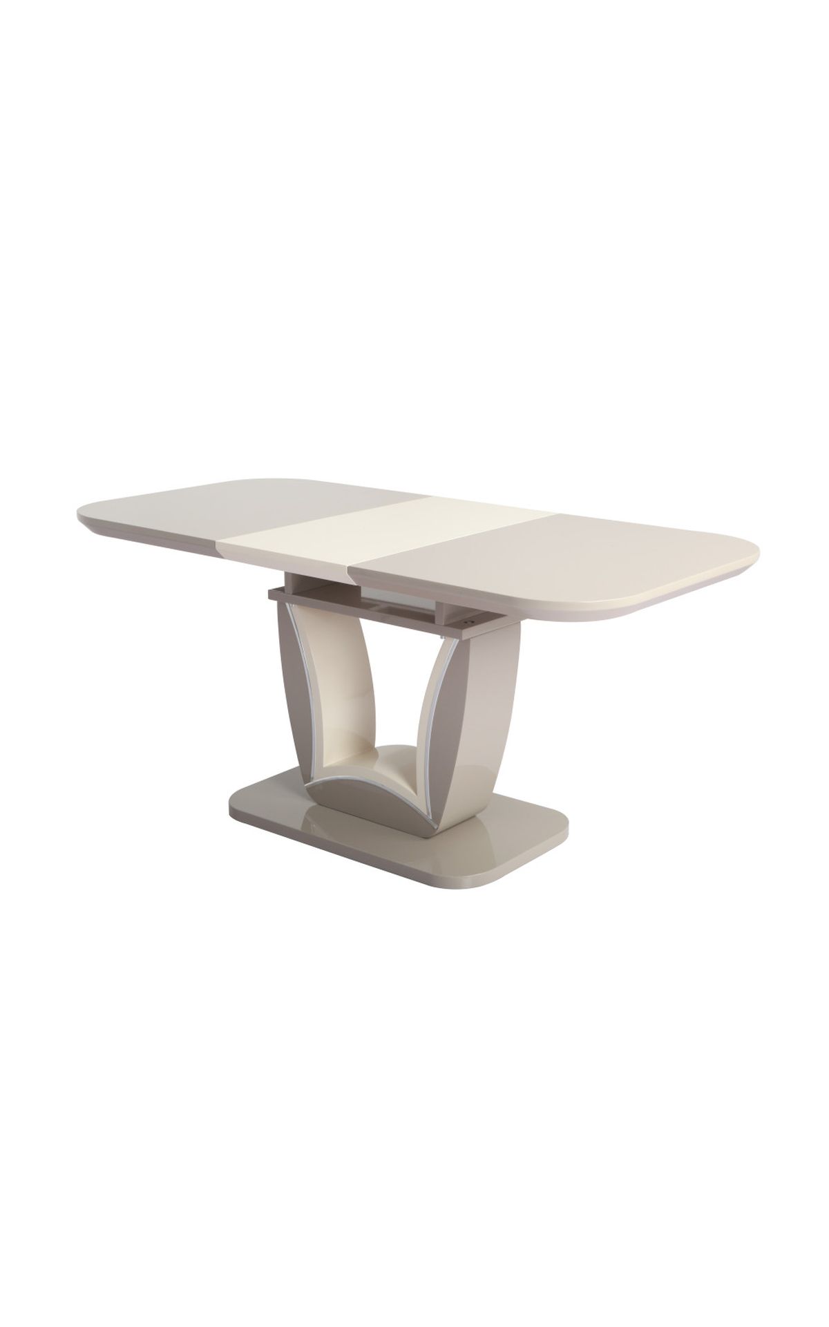 Az asztal lapja magas fényűre festett MDF, bővítése speciális billenő mechanikával és erős bovdenes vasalattal történik. A talp és a díszítő elemek anyaga szintén festett MDF.