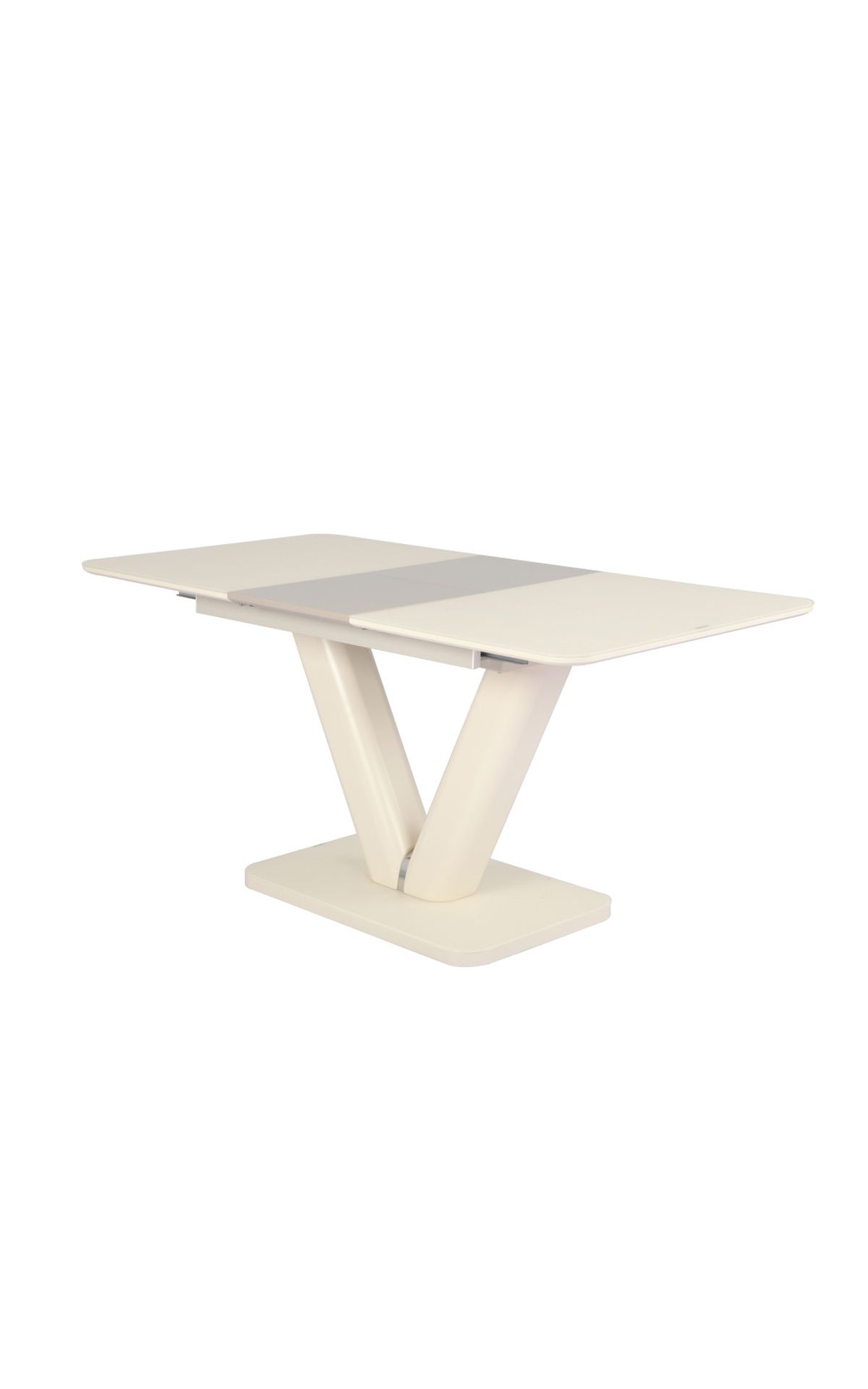 Az asztal lapja matt festett MDF melyet edzett üveggel fedtek, bővítése speciális billenő mechanikkával és erős bovdenes vasalattal történik. A lábazat anyaga szintén matt festett MDF fém díszítő elemmel. A talp rész szintén edzett üveggel van fedve.